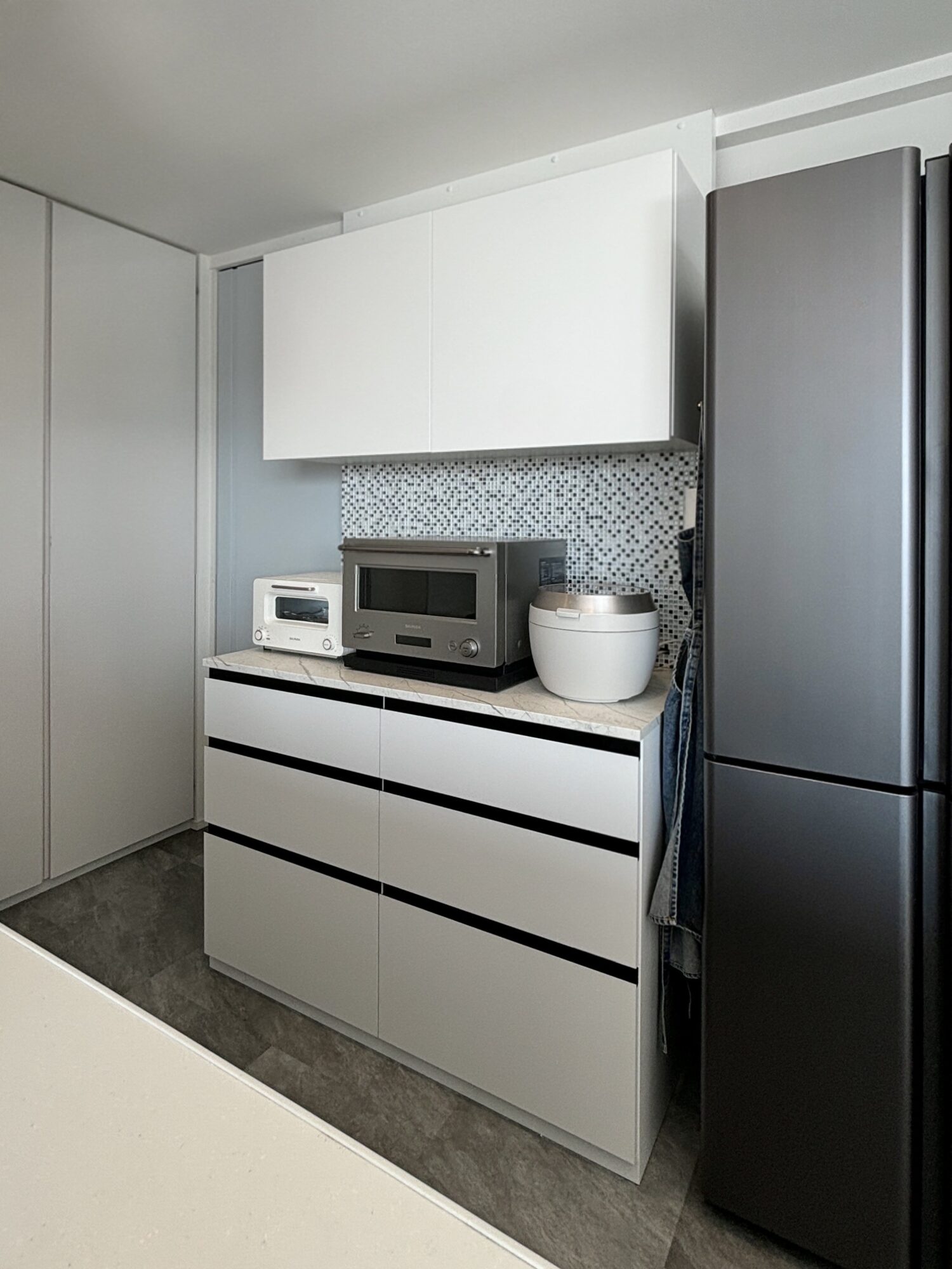 天板はホワイトサンダー柄、引出収納は扉手掛かり部分のみブラック仕上です。